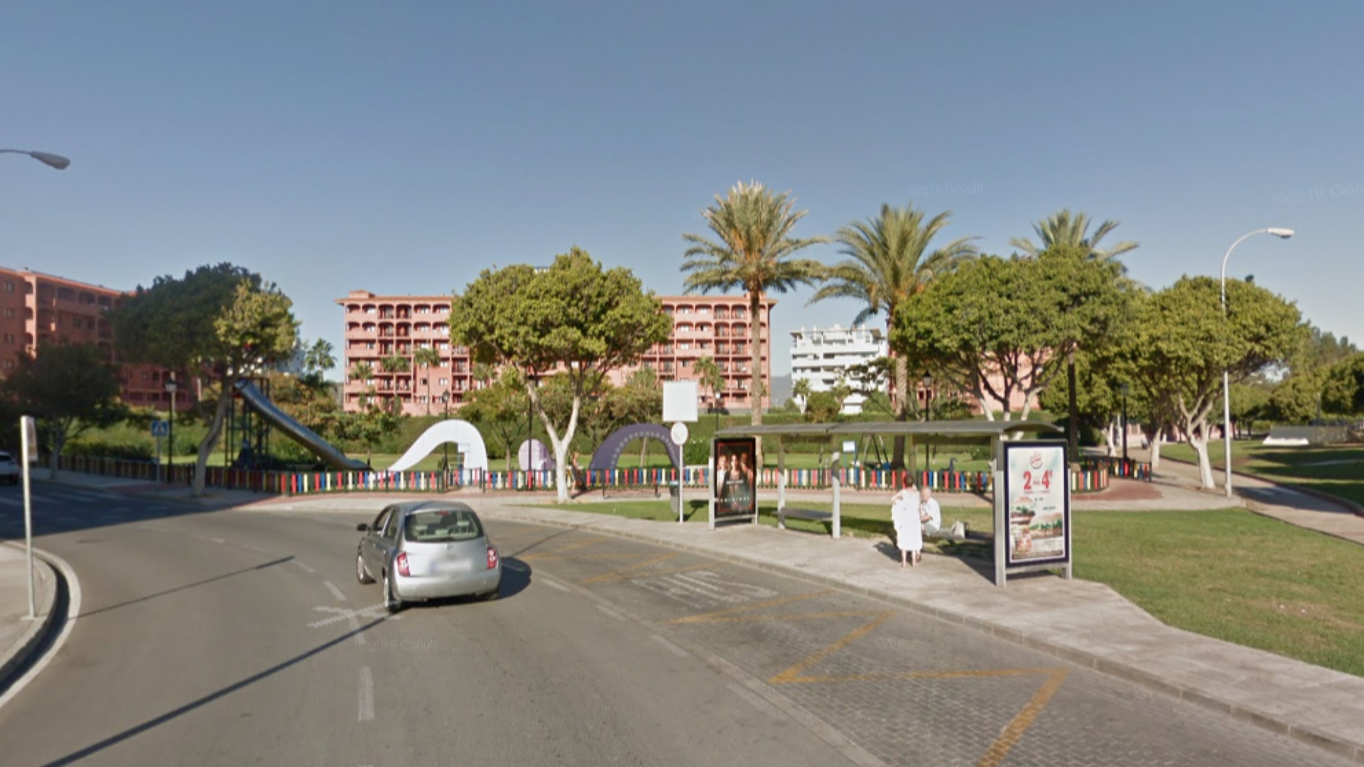 Marquesina publicitaria ubicada en la intersección de Calle San Gabriel con Calle Virgen del Rosario (Fuengirola), junto al Centro Comercial Miramar, en un entorno de alta afluencia y tránsito continuo. Su posición, integrada en una zona de paso peatonal, ofrece gran visibilidad y repetición: el mensaje acompaña al público en sus desplazamientos hacia el centro comercial y áreas colindantes, captando atención en momentos de espera.