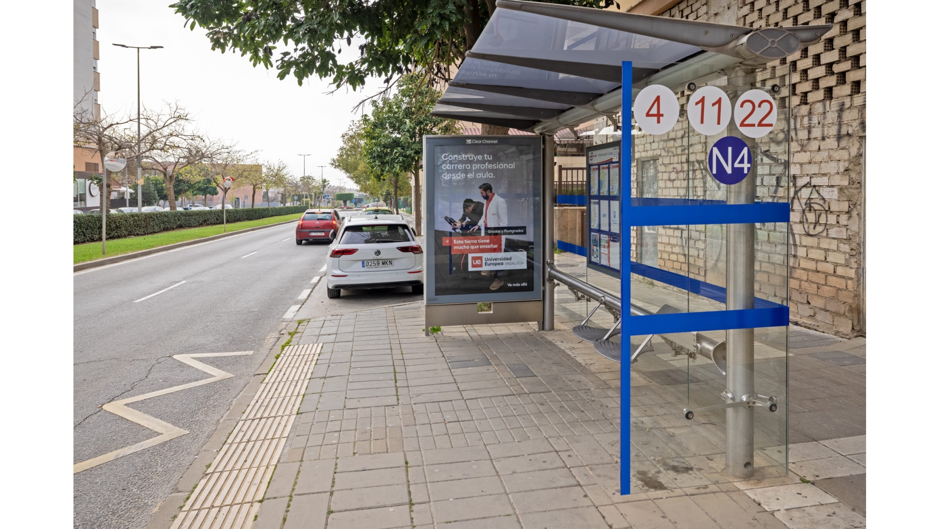 Marquesina situada en el entorno de Teatinos, una de las zonas con mayor actividad diaria de Málaga por su concentración de campus universitario, residencias, clínicas y servicios. Punto de gran valor para campañas que buscan alcance repetido en público joven-adulto, profesionales y familias, con tránsito constante durante toda la semana. Ideal para branding y performance (QR/CTA) gracias a la frecuencia de paso y al uso intensivo del transporte público en la zona. Aporta una presencia consistente en el entorno y ayuda a construir cobertura por capas en la ciudad.