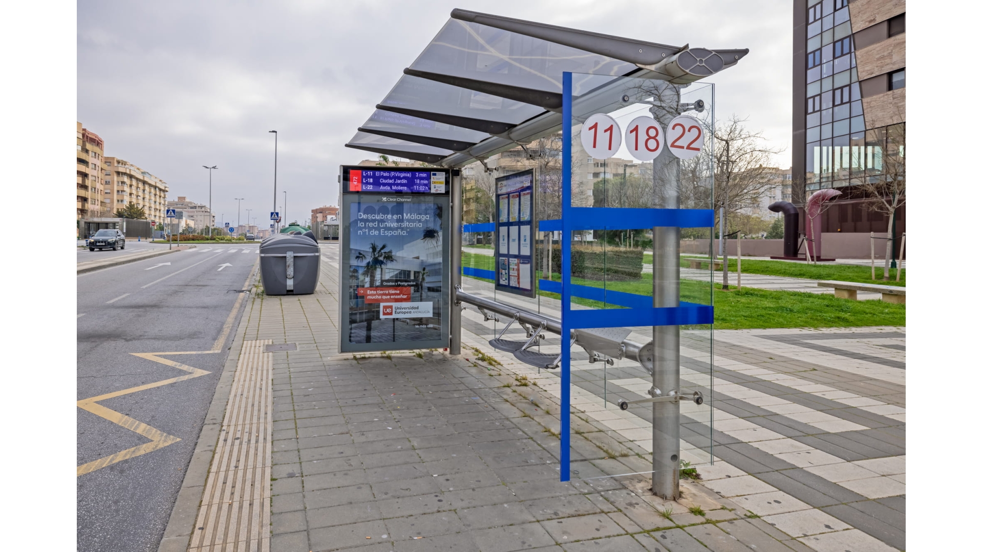 Marquesina situada en el entorno de Teatinos, una de las zonas con mayor actividad diaria de Málaga por su concentración de campus universitario, residencias, clínicas y servicios. Punto de gran valor para campañas que buscan alcance repetido en público joven-adulto, profesionales y familias, con tránsito constante durante toda la semana. Ideal para branding y performance (QR/CTA) gracias a la frecuencia de paso y al uso intensivo del transporte público en la zona. Recomendable para creatividades limpias, alto contraste y mensajes de lectura rápida.