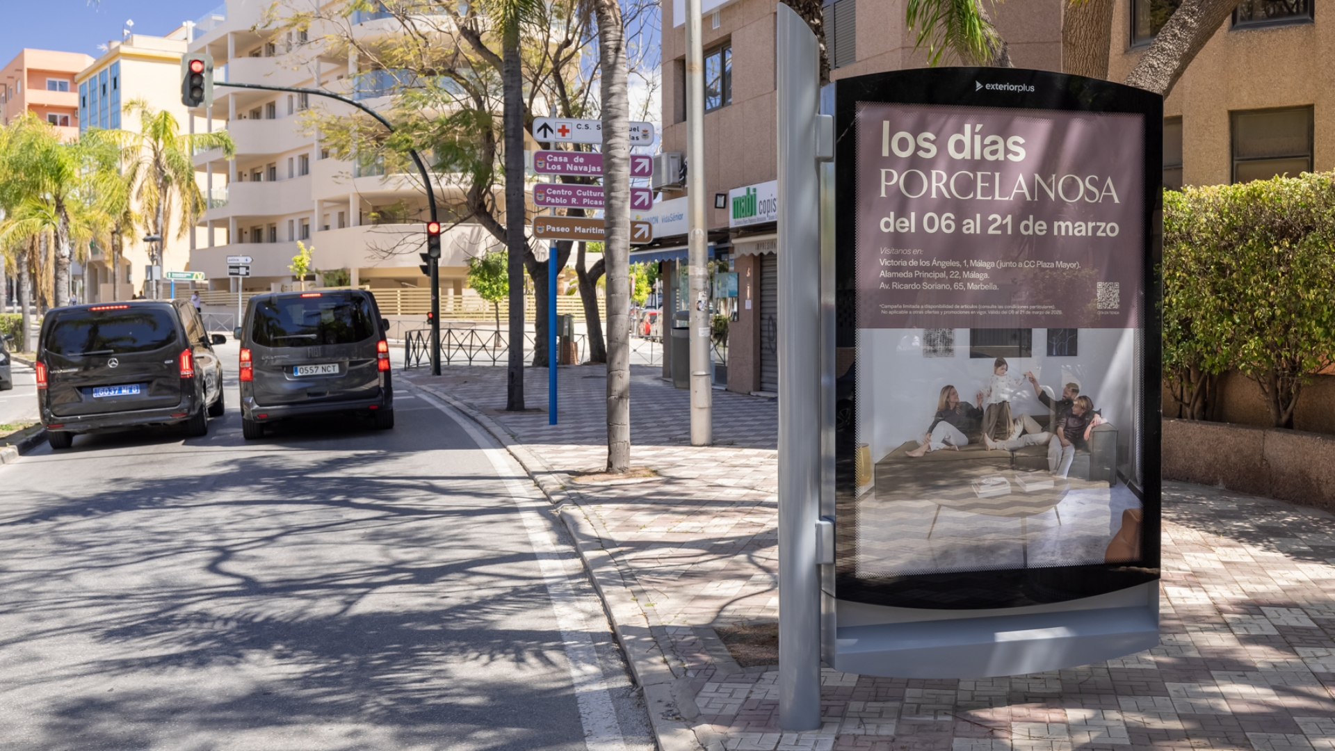 Gracias a su formato integrado en el mobiliario urbano, este mupi permite reforzar la presencia de marca de forma cercana y recurrente, impactando tanto a residentes como a visitantes que se desplazan por una de las avenidas más relevantes de Torremolinos. Una opción eficaz para campañas de notoriedad, promoción local y comunicación comercial en la Costa del Sol.