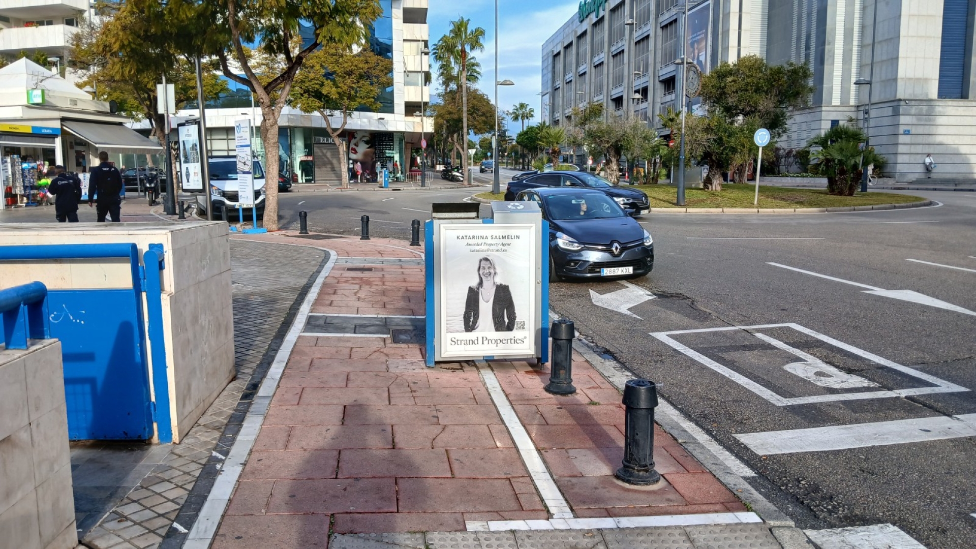 PAPELERA PUBLICITARIA, Rotonda de El Corte Inglés de Puerto Banus, en la esquina de la plaza Antonio Banderas, entrada al parking subterraneo Saba.
