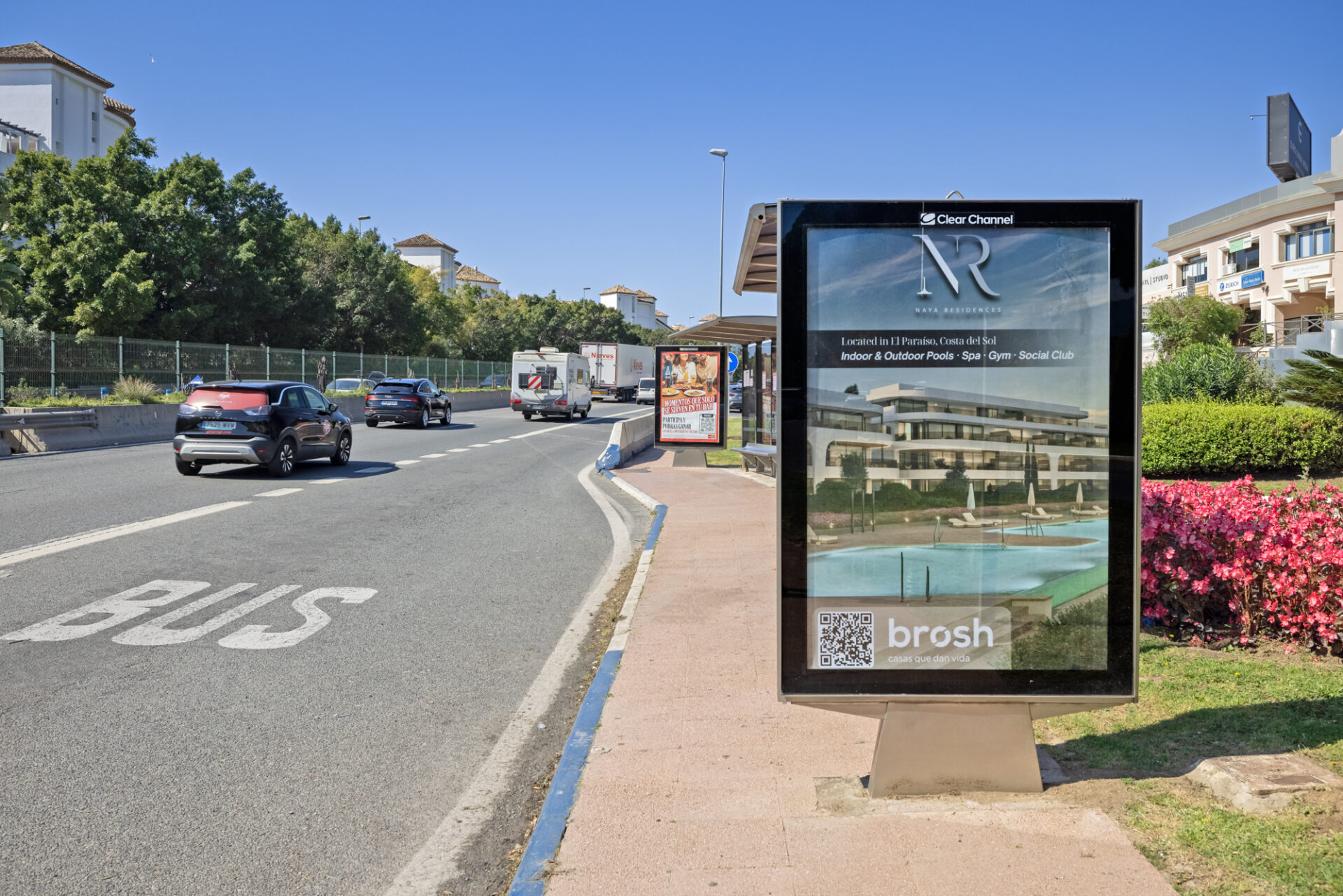 La combinación de gran formato en carretera, mobiliario urbano en enclaves premium y presencia en aeropuerto permite a Brosh construir una comunicación más sólida, con visibilidad en puntos de alta exposición y en momentos clave del recorrido del potencial comprador.