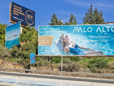 Valla publicitaria de medidas 8x3 metros, situada en Marbella en la autovía A7 pasado el C.C. La Cañada en dirección hacia Fuengirola. En las inmediaciones más cercanas se encuentran accesos al polígono industrial La Ermita y a diferentes playas.