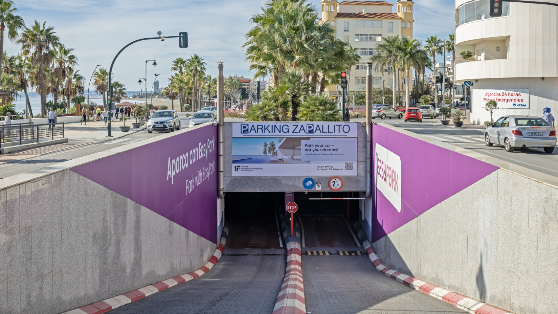 Vinilo de gran formato (513x157 cm) situada en la entrada principal de vehículos del Parking Zapallito, en pleno centro de Estepona. Un emplazamiento muy visible que asegura un elevado número de impactos diarios tanto en residentes como en turistas.